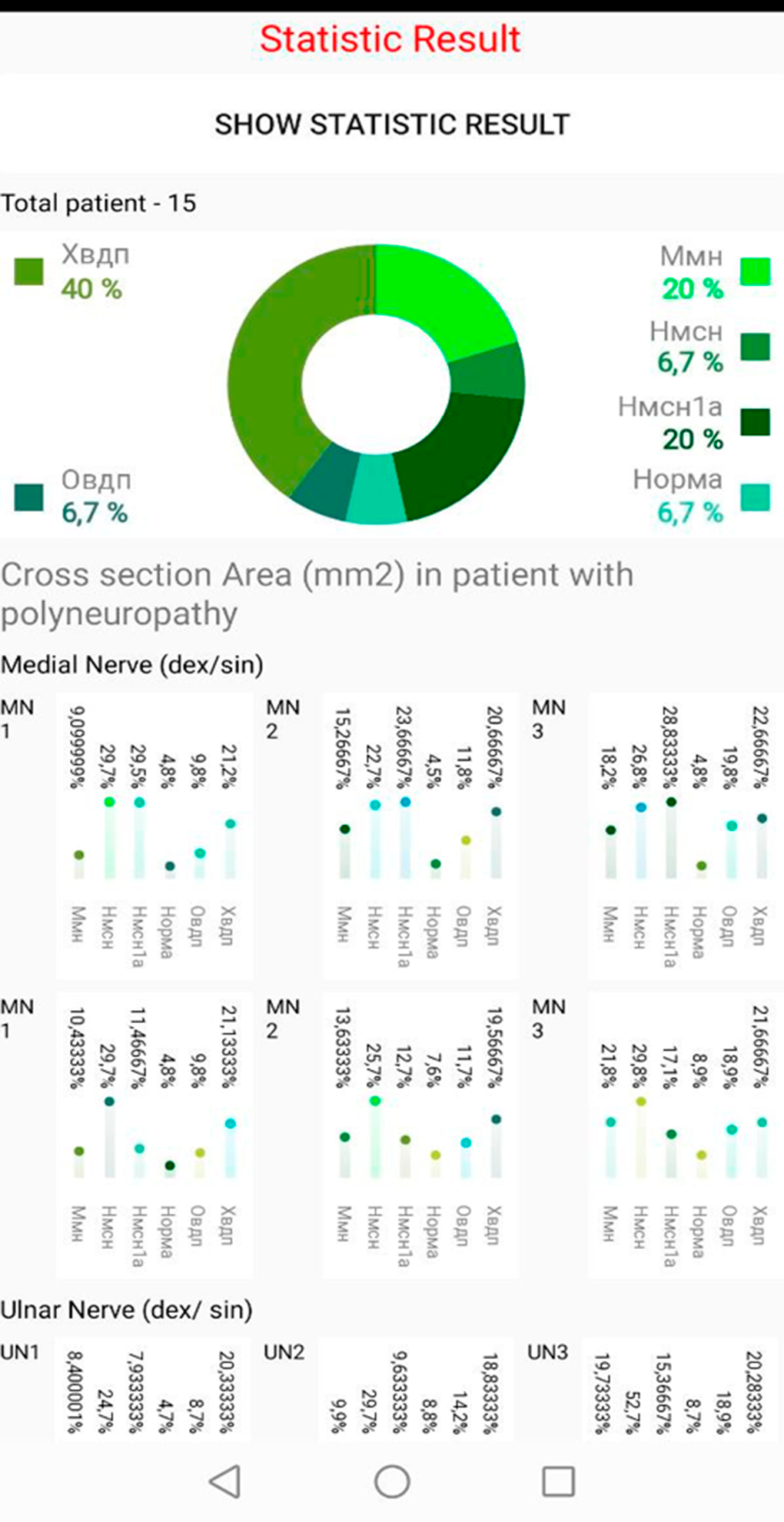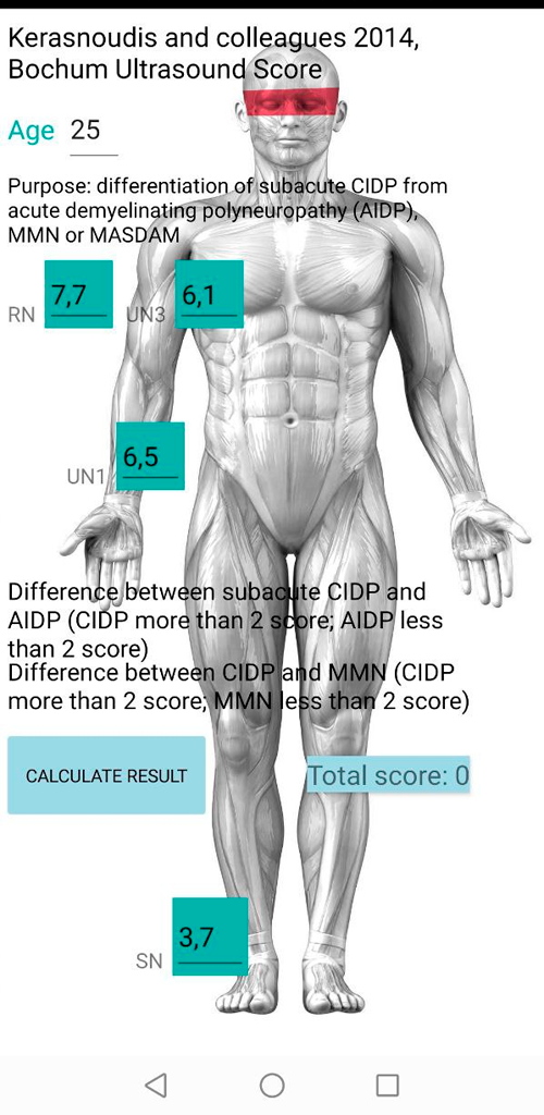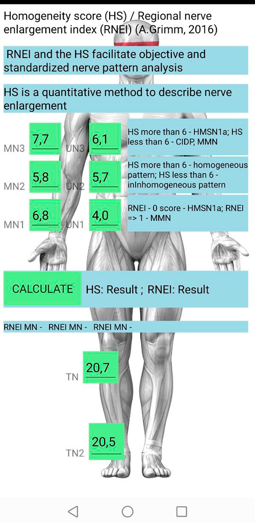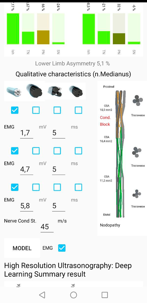 Our Application can create assesment of cross section area of peripheral nerve patient and save on internal database, calculate inter-nerve variability, intra-nerve variability, asymmetry, totan abnormality results, and abnormal results for brachial plexus, medial, ulnar, tibial, peroneal and sural nerves in both size. You can create Microsoft Word document with common result and print there. In Analize page you find graphic result of deep neural networks with algorithms, pretrained models for find normal and abnormal cross section area of peripheral nerve for some polyneuropathy. Also Application Include internal Real-Time statistic all forms of polyneuropathy with other variant of treatments. Calculator most popular ultrasound scales for asessment peripheral nerve cross section area (BUCHUM-ultrasound score, UPSS, Homogeneity Score, Regional Nerve Enlagment index and other).