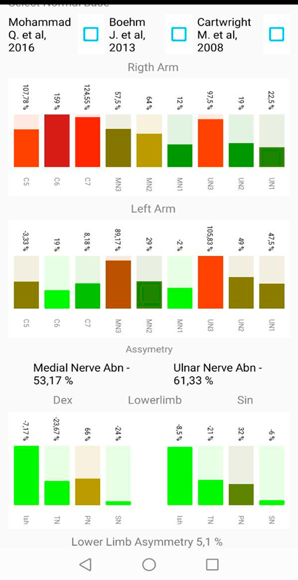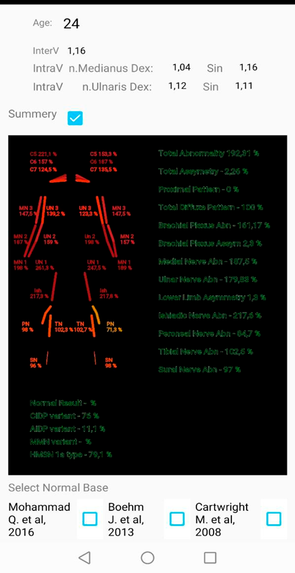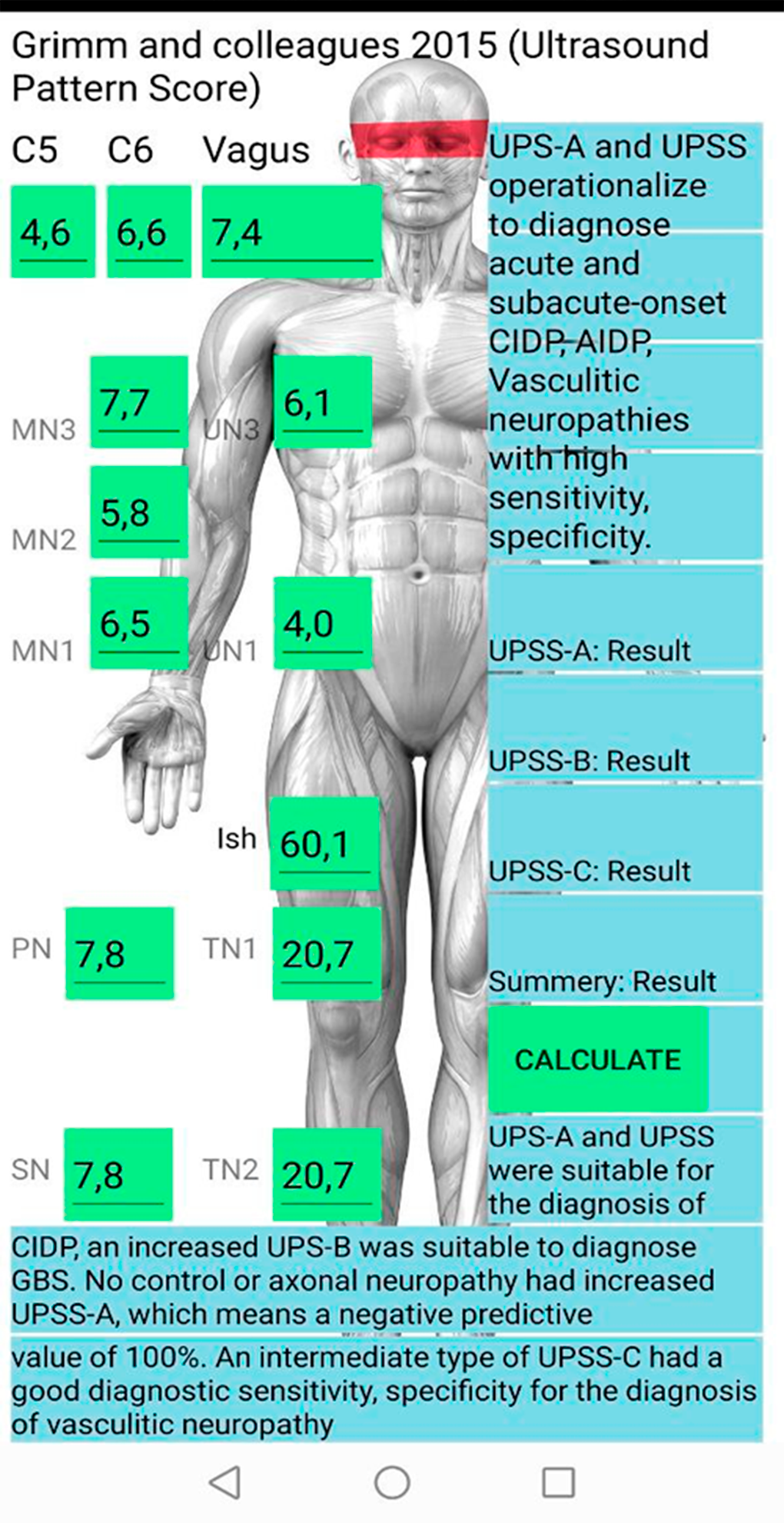 Our Application can create assesment of cross section area of peripheral nerve patient and save on internal database, calculate inter-nerve variability, intra-nerve variability, asymmetry, totan abnormality results, and abnormal results for brachial plexus, medial, ulnar, tibial, peroneal and sural nerves in both size. You can create Microsoft Word document with common result and print there. In Analize page you find graphic result of deep neural networks with algorithms, pretrained models for find normal and abnormal cross section area of peripheral nerve for some polyneuropathy. Also Application Include internal Real-Time statistic all forms of polyneuropathy with other variant of treatments. Calculator most popular ultrasound scales for asessment peripheral nerve cross section area (BUCHUM-ultrasound score, UPSS, Homogeneity Score, Regional Nerve Enlagment index and other).